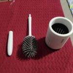 I recently carpeted my en-suite (yeah, I know nobody does that these days but I hate cold feet and it’s only me that uses it!) and wanted a wall mounted toilet brush to keep it off the floor. I came across this and hadn’t even heard of rubber-bristles on a loo brush before but I use rubber/silicon brushes for other cleaning and they’re really good so thought it was worth a try. And it’s great! Easy to mount with the adhesive sticker which is really strong and definitely won’t fall off. Simple screw-on handle and plonk it into the holder, and it’s good to go!