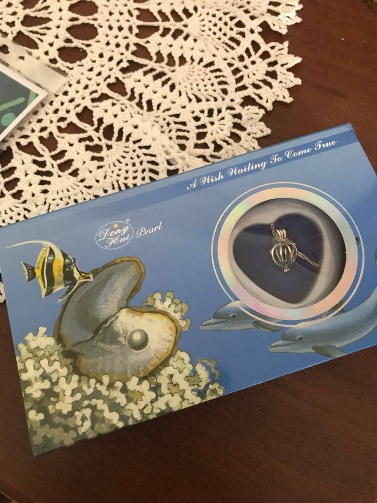 I loved both the necklace and the pearl. The necklace chain is of great quality, very shiny and thick with a strong clasp. The pearl itself was shiny and a lavender purple color, which according to the card represents wealth. The pearl was more egg shaped than round, and fits in the locket perfectly. The other thing I like is that the cage of the pendant has a three loop mechanism to thread the chain thru instead of an open-close hinge snap. So basically it could never accidentally open. It’s really beautiful and substantial! I was expecting a fishy smell or odor inside the shell, but it didn’t smell like anything. I mean the oyster meat stuff is there but it’s just water. Anyway, I love it , the price, and the quality. Finally a purchase I don’t regret or have to supplement parts
