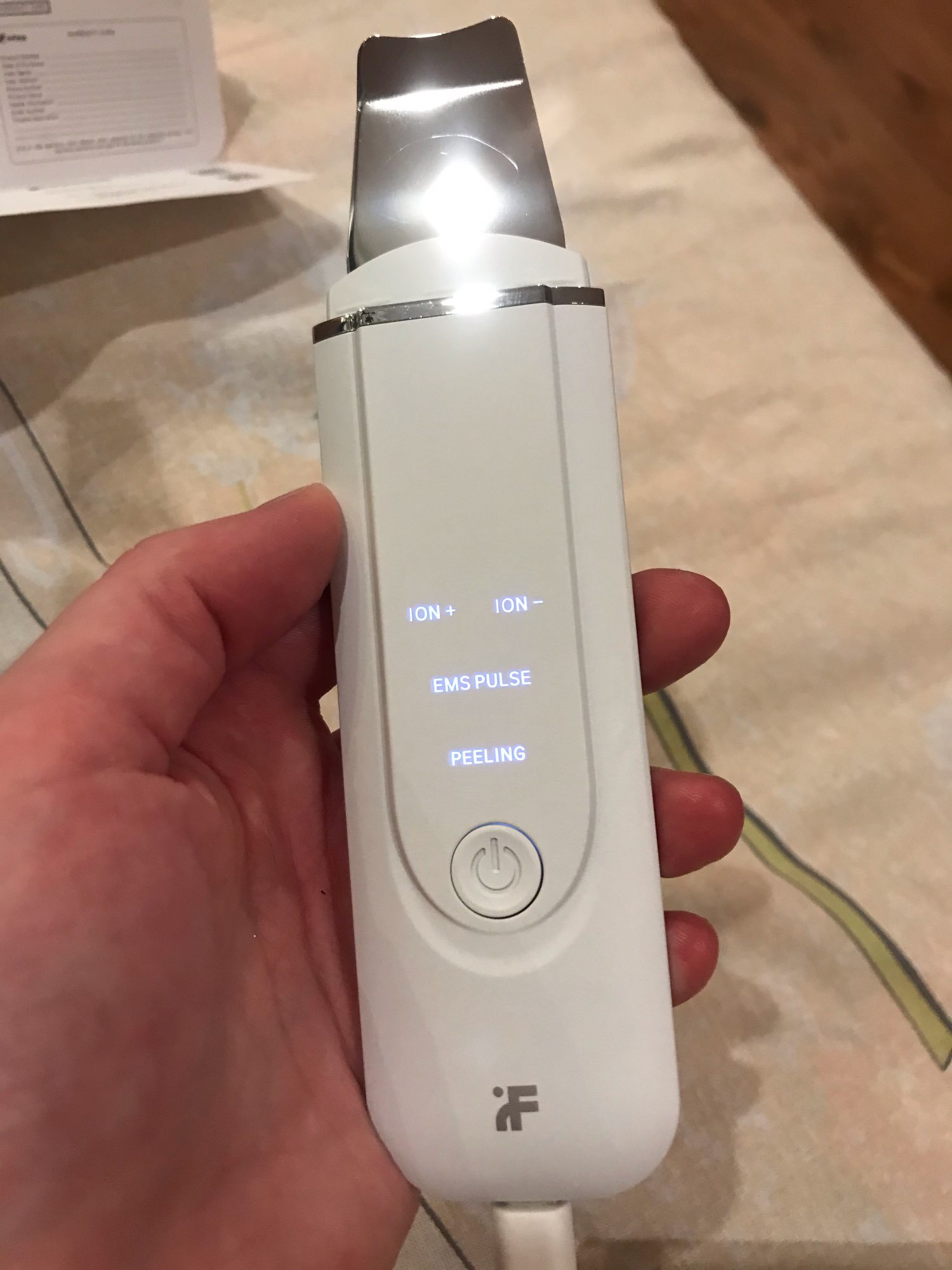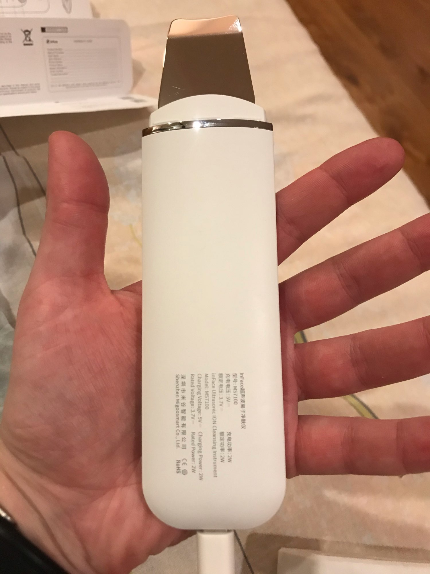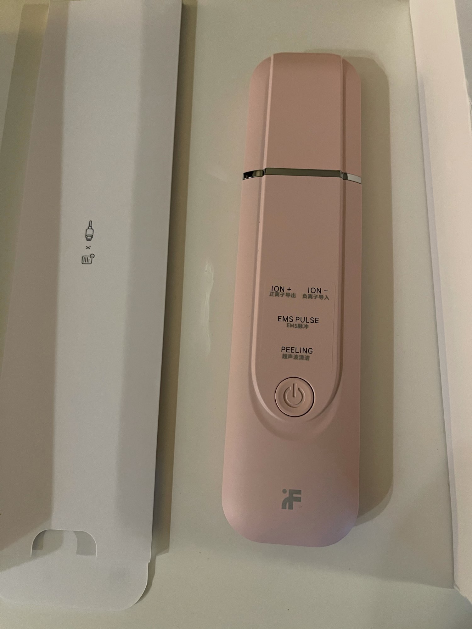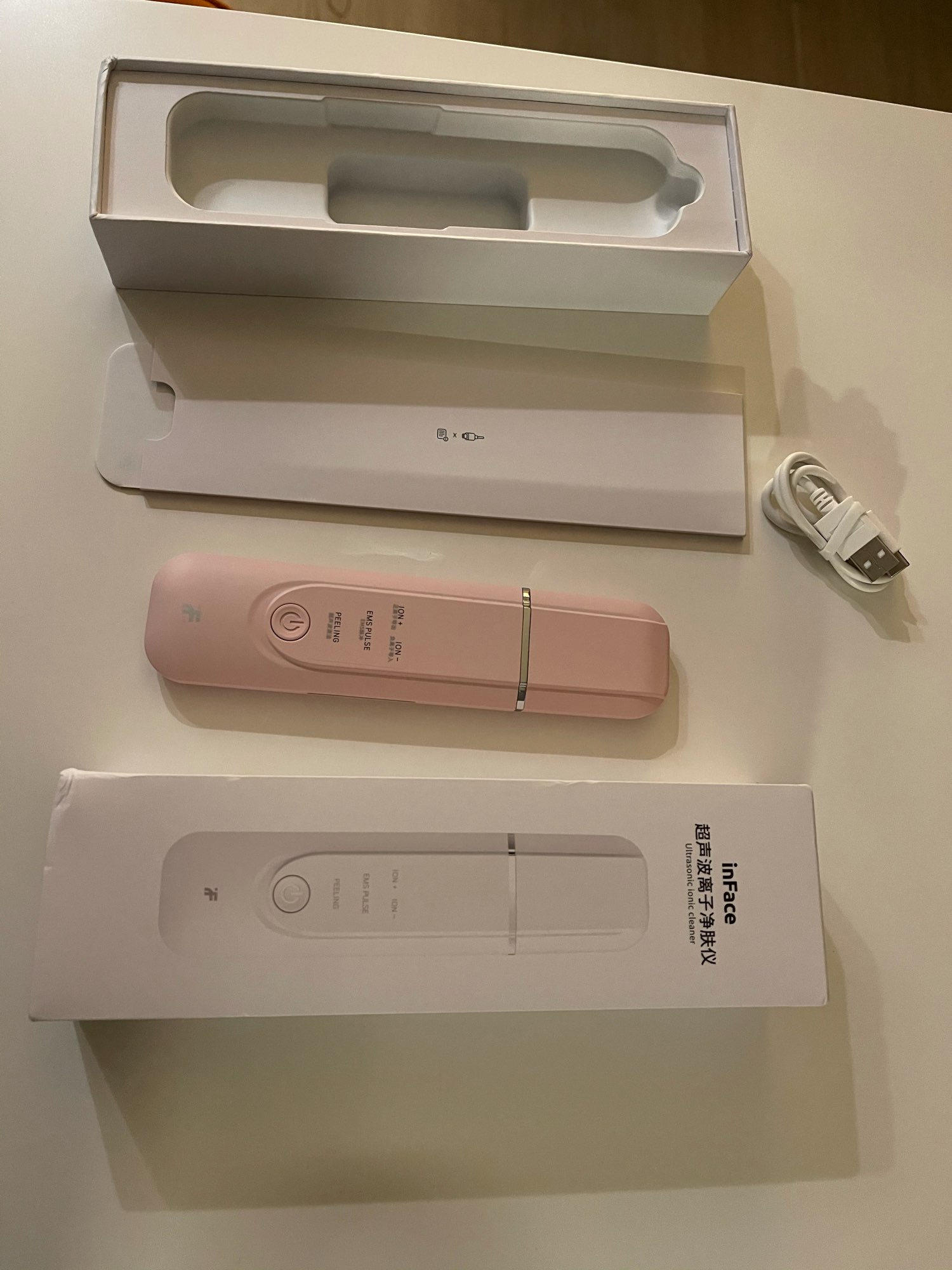He recibido el producto en perfectas condiciones y en solo 3 días con envío desde España. Viene con un cable cargador USB tipo C e instrucciones en inglés. La espátula viene protegida con un film protector. Es de la marca inFace.